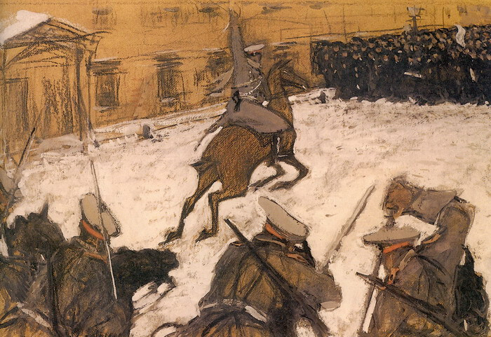 В Петербурге дело обстоит очень серьезно. На Казанской площади стреляли в лежачую толпу. Раненых и убитых переносили в Думу. Сейчас мне сказали по телефону из двух редакций, что Государственная Дума распущена, что кабинет министров подал в отставку и, что четыре гвардейских полка (Преображенский, Волынский и еще два) перешли на сторону «народа» (?!) и что будто бы взят Арсенал… Убит будто бы командир Преображенского полка.