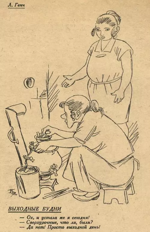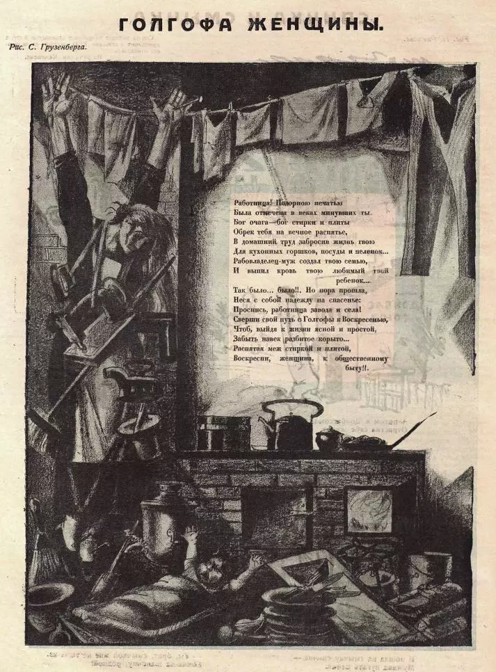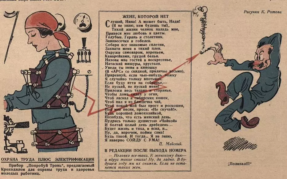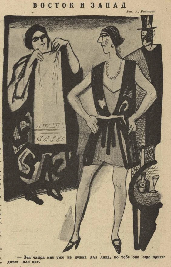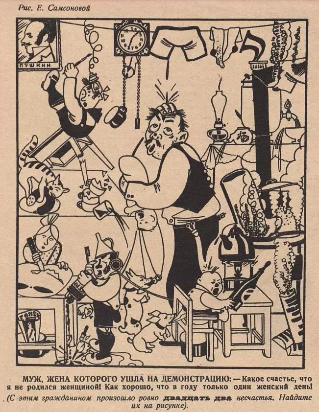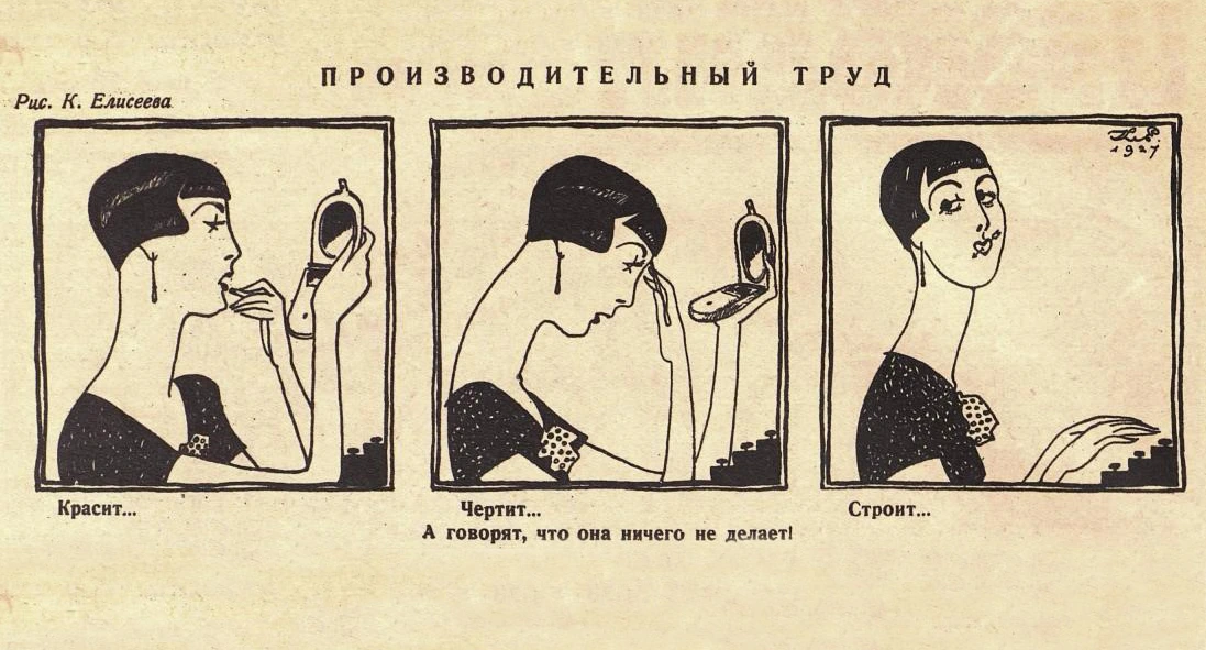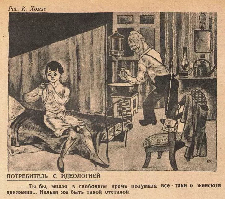 Как это часто бывало и со многими другими амбициозными проектами большевиков, «раскрепощение женщины» часто оборачивалось, с одной стороны, принуждением, а с другой — показухой, что наглядно иллюстрируют карикатуры. Эти карикатуры мы отобрали из двух самых популярных сатирических журналов того времени — московского «Крокодила» и ленинградского «Смехача». Оба они родились в начале 1920-х годов и использовались властью в качестве инструмента пропаганды, высмеивая остатки «старого мира» и уродливые явления мира нового — религию, побежденные классы, врагов советской власти, бюрократов, взяточников, растратчиков и так далее. Что касается «женского вопроса», то предметом сатиры становятся, с одной стороны, несознательные женщины и противящиеся новым установкам по «женскому вопросу» мужчины, а с другой — наоборот, «перегибы» в деле раскрепощения.