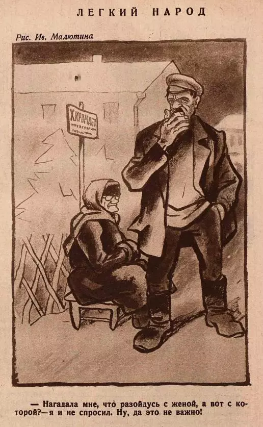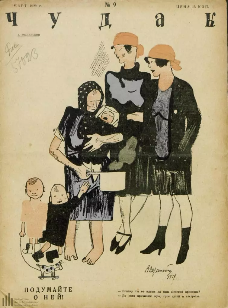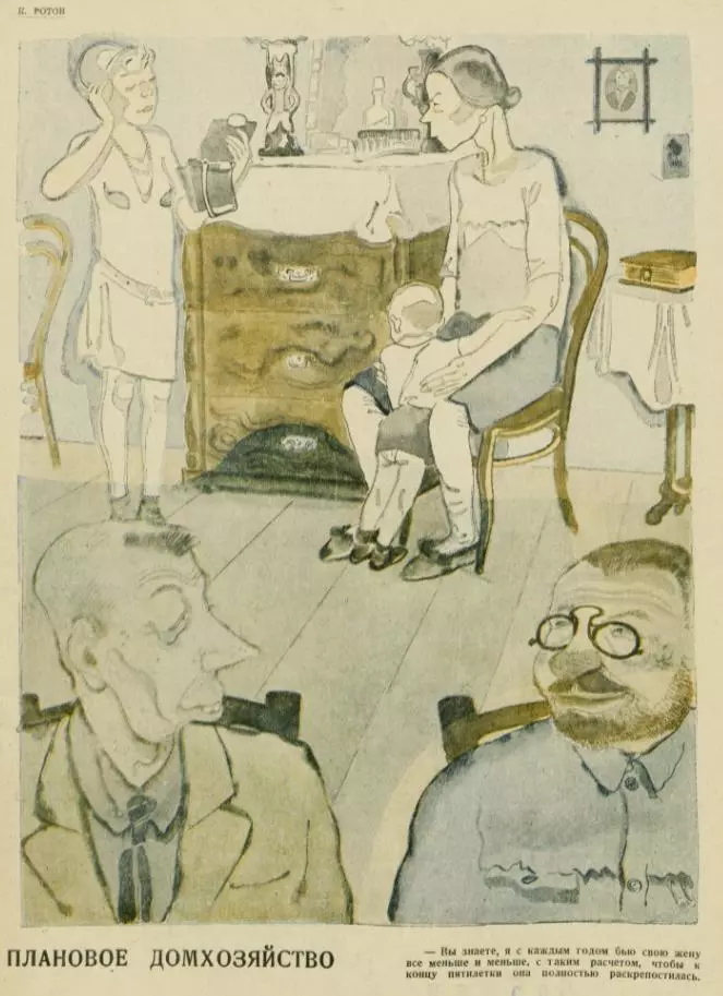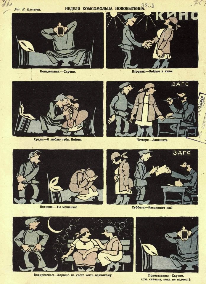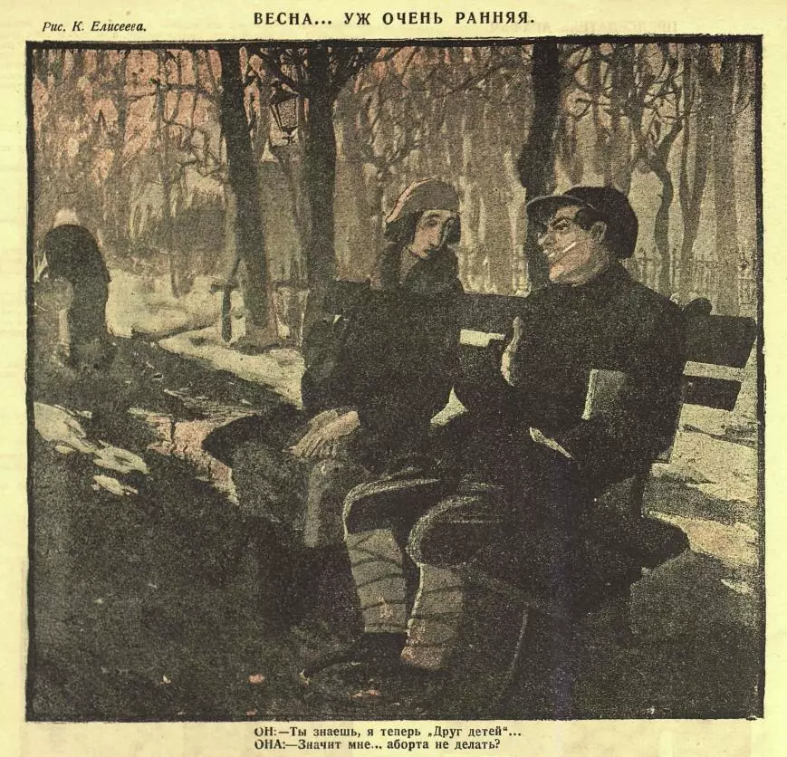 На деле отношение ко всем этим свободам в обществе — даже среди искренних сторонников советской власти — было двойственным. Как видно даже из сюжетов карикатур, большинство продолжало ценить традиционную, стабильную семью (при условии, что она живет «новым бытом», о чем мы поговорим в следующем эпизоде) и порицать тех, кто злоупотреблял новыми возможностями, пусть и не нарушая буквы закона, — причем это касалось как мужчин, так и женщин. Советское руководство тоже было вынуждено лавировать между «раскрепощением» с его матримониальными и сексуальными свободами с одной стороны — и демографическим кризисом после Гражданской войны, эпидемий и массовой эмиграции с другой. Именно последними соображениями было вызвано ограничение абортов и появление инициатив (не сразу реализованных) типа налога на бездетность.
