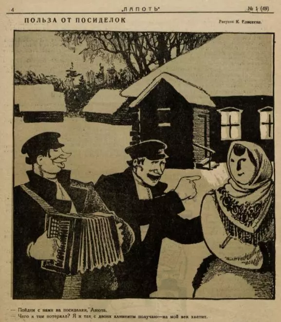 Рис. М. Черемных. «Крокодил», 1922, № 15.В … сельсовет прошло большинство женщин. (Из газет.)