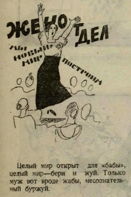 Освобождение женщины и кардинальное изменение ее роли в обществе было одной из целей, провозглашенных большевиками сразу после захвата власти в октябре 1917-го. Первые пять лет претворению этой цели в жизнь мешал хаос, в который погрузилась значительная часть страны — гражданская война, красный террор, криминальное насилие, голод, эпидемии тифа и холеры и так далее. Коротко говоря, и большевикам, и самим российским женщинам было немного не до того. Однако уже в первые месяцы были приняты декреты, уравнивающие женщин и мужчин в правах — как политических, так и гражданских, трудовых и семейных. В 1919 году были созданы так называемые Женотделы — учреждения при ЦК и местных комитетах РКП(б) по работе среди женщин. Первой заведующей Женотдела при ЦК стала революционерка Инесса Арманд; в 1920 г., когда Арманд умерла от холеры, ее сменила на этом посту Александра Коллонтай, еще в 1913 году опубликовавшая программную статью «Новая женщина». В ней она призывала женщин к тому, чтобы стать полноправными членами общества, для чего, по мнению Коллонтай, лучше всего было вообще отказаться от института семьи и практиковать «свободную любовь». Хотя идеи Коллонтай были слишком радикальными даже для многих большевиков (но пользовались популярностью среди части молодежи), ее идея о создании «женотделов» поначалу нашла поддержку у партии. Задачей женотделов было «воспитание женщин в духе социализма и привлечение их к хозяйственному строительству и государственному управлению; координация процессом трансформации институтов брака и материнства, изменение бытовых условий». В 1930 году женотделы были упразднены.