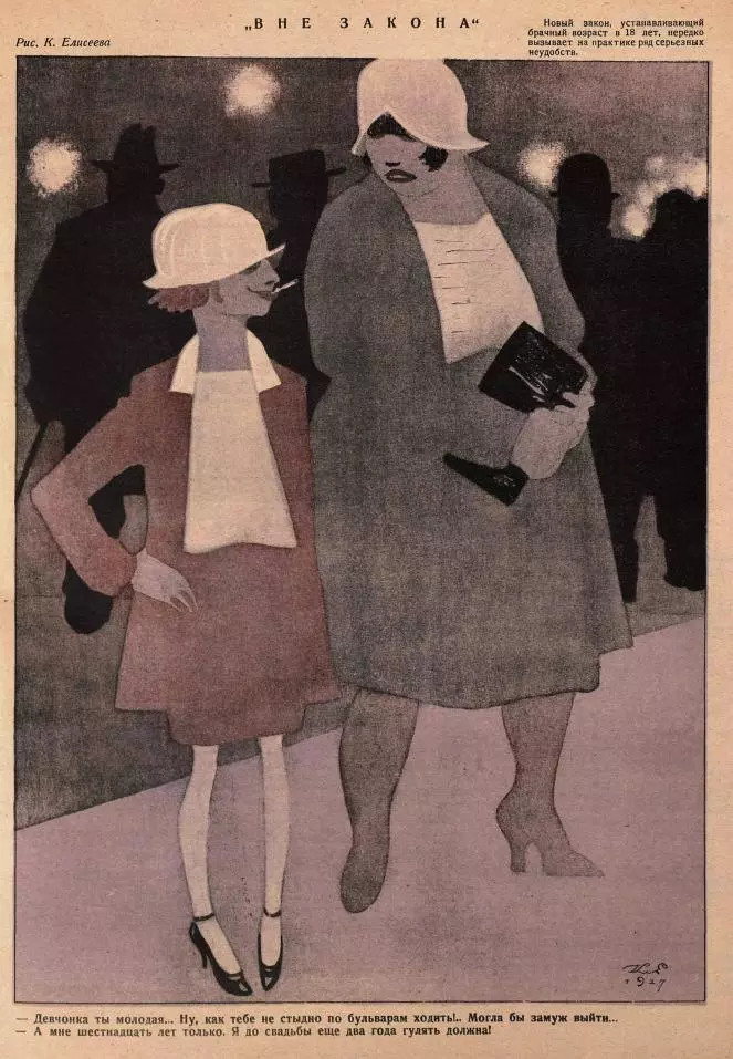 Еще одной темой для сатиры стало общественное явление, которое очень раздражало советское руководство, — проституция. Ведь, казалось бы, она должна была немедленно исчезнуть, когда женщина раскрепостилась, получив все права и свободы. Однако в действительности проституция в больших городах стала, наоборот, гораздо более распространенным явлением, чем до 1917 года. Этому способствовало много факторов — в частности, обнищание населения и значительный приток в города деревенской молодежи. В конце 1919 года была создана Комиссия по борьбе с проституцией при Наркомате здравоохранения, а затем Межведомственная комиссия по борьбе с проституцией при Наркомате соцобеспечения. Но административные меры не помогали: по данным опросов, в 1923 году услугами проституток пользовалось от 40% до 60% взрослых мужчин в городах. Поначалу самих женщин (в отличие от виновных в сводничестве и притоносодержании) не преследовали, поскольку они считались «жертвами капиталистических предрассудков». Только начиная с 1928–1929 годов особо «злостных» стали в административном порядке направлять в контролируемую НКВД систему «специальных учреждений принудительного трудового перевоспитания» — артелей, мастерских открытого типа, полузакрытых трудпрофилакториев и загородных колоний специального режима. В годы Большого террора эти учреждения стали частью ГУЛАГа, а самих проституток иногда осуждали по политическим статьям — как классовых врагов. При этом тема проституции полностью исчезла со страниц прессы, в том числе сатирической. Проституция в СССР официально — но не в реальной жизни, разумеется, — перестала существовать.