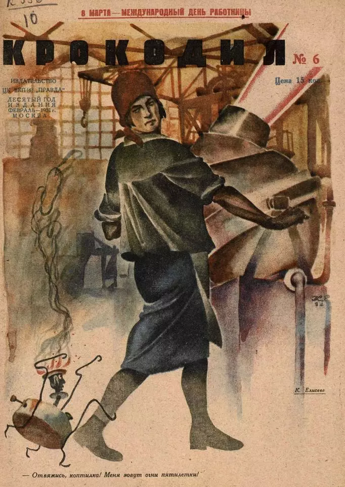 *ВСНХ — Высший совет народного хозяйства, центральный орган управления народным хозяйством в СССР до 1932 г. (тогда он был преобразован в систему отраслевых народных комиссариатов, т. е. министерств). Тресты, действовавшие в период НЭПа, представляли собой объединения государственных предприятий одной отрасли, действовавшие на принципах хозрасчета, т. е. получения прибыли.КРОКОДИЛ: — Ну-ка, товарищ работница, пожалуй ко мне на первую страницу.