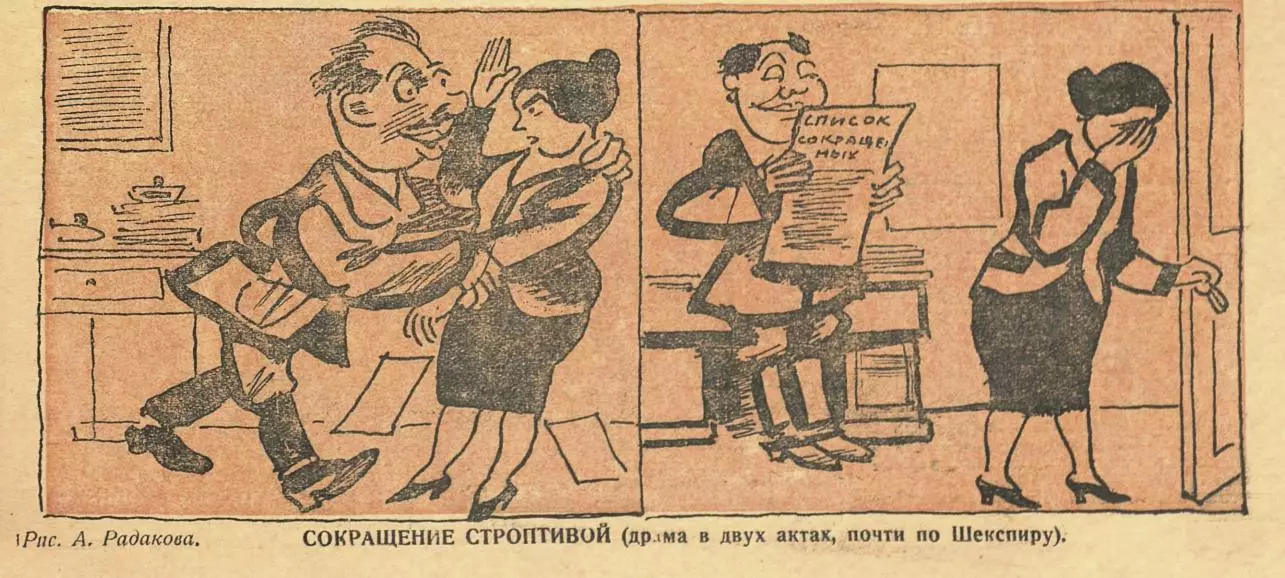 Достижения советской власти часто приводили к возникновению новых проблем. Например, полное открытие рынка труда для женщин и их активная мобилизация на производство и в советские учреждения — за счет отказа от «старого быта» — увенчались к середине 1920-х годов успехом: женщин стало значительно больше везде. Впрочем, в основном это были молодые девушки, поэтому руководящие посты они занимали нечасто. Если говорить об учреждениях, то советская бюрократия разрасталась бурными темпами, быстро затмив по своим масштабам бюрократию дореволюционную. Строгая иерархичность способствовала злоупотреблениям. Главным из них было «кумовство» — практика найма и карьерного продвижения (без учета интересов службы) жен, братьев, сестер, их супругов и других близких и дальних родственников. А своеобразной разновидностью кумовства было аналогичное покровительство, оказываемое мужчинами-начальниками подчиненным «хорошеньким» девушкам — разумеется, не бескорыстно. Более того, этот «административный ресурс» мог становиться орудием принуждения — несговорчивых или их родственников всегда можно было сократить. Как все мы хорошо знаем, эти практики надолго пережили СССР, да и в западных странах они до самого последнего времени использовались с не меньшим энтузиазмом. Интересно, что карикатуристы 1920-х (исключительно мужчины), выставляя советских бюрократов-сластолюбцев в сатирическом свете, делают это довольно добродушно. Более того, нередко сатирическое перо направлено в сторону самих женщин, строящих карьеру «через постель».
