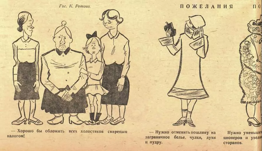 Рис. А. Радакова. «Крокодил», 1926, № 4.ПОЖЕЛАНИЯ ПО ЖЕНСКОМУ ВОПРОСУ