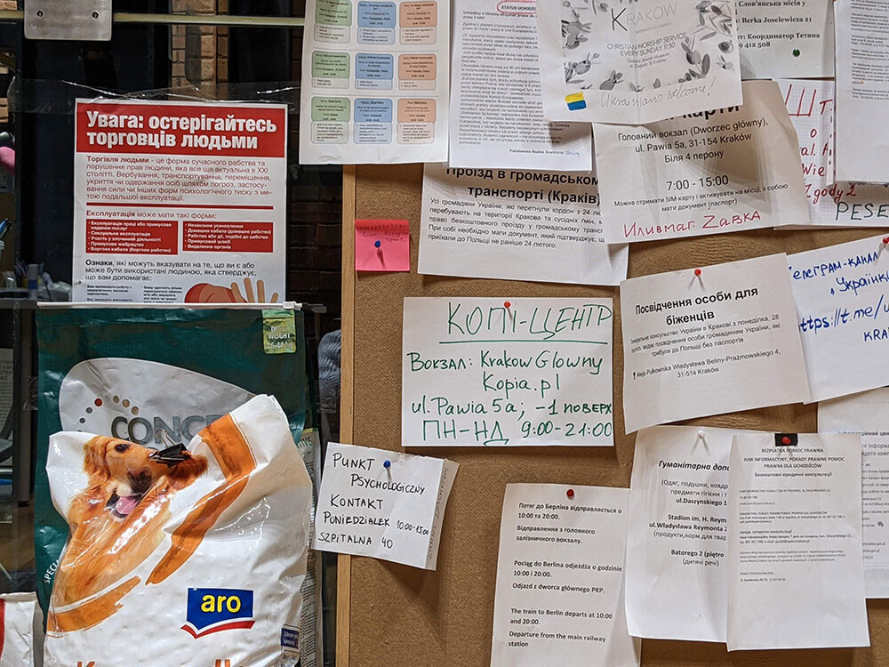 В польском сегменте фейсбука популярен мем: Йозеф Пилсудский с портрета поздравляет Владимира Путина с тем, что тот «смог объединить даже поляков». Центр, где я помогаю, — часть коалиции «Открытый Краков», созданной более чем полсотней местных НКО и городской администрацией для координации помощи беженцам. Тут они получают правовую и медицинскую помощь, информацию, одежду, лекарства, находят жилье. В нашем офисе среди прочего есть списки мест, где в Кракове украинцам можно пообедать бесплатно, листовки с инструкциями для тех, кто ищет работу, список польских организаций, куда можно обратиться, чтобы сделать аборт, криминализированный в Польше, или в случае торговли людьми.
