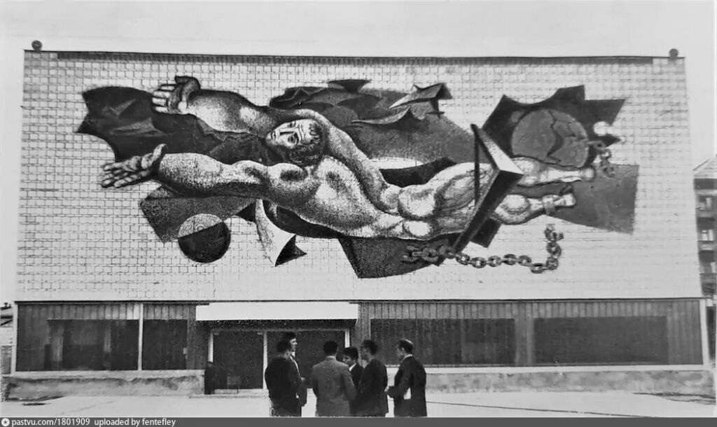 Фото: Мозаичное панно «Освобожденный человек» на фасаде спорткомплекса «Урал» в Свердловске, 70-е годы. Источник: книга «Советское декоративное искусство 1945-1975», издательство «Искусство», 1989