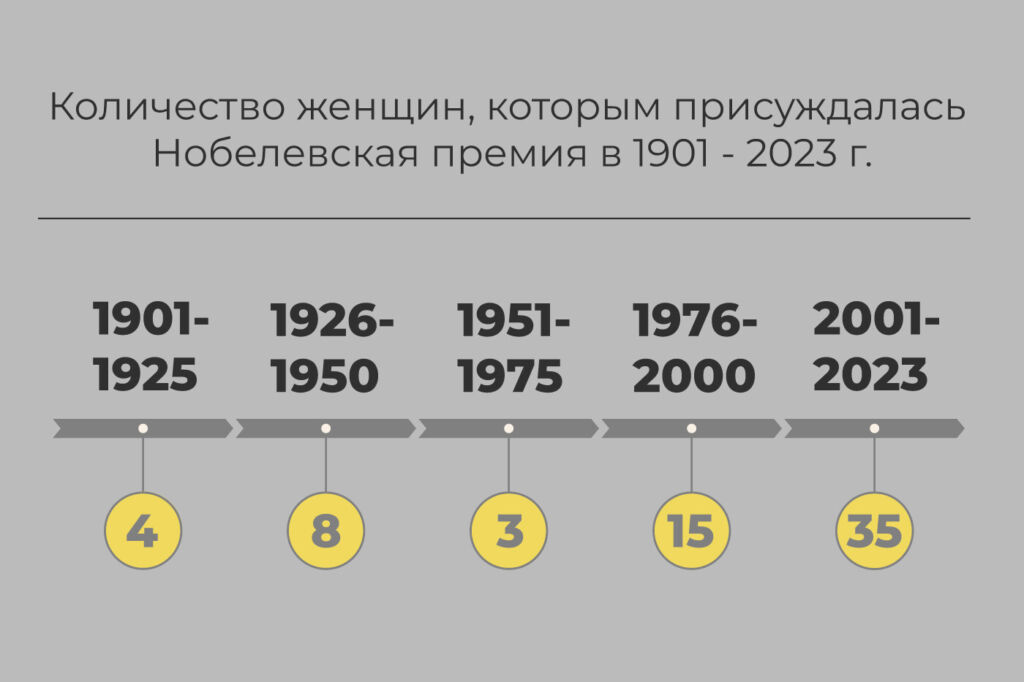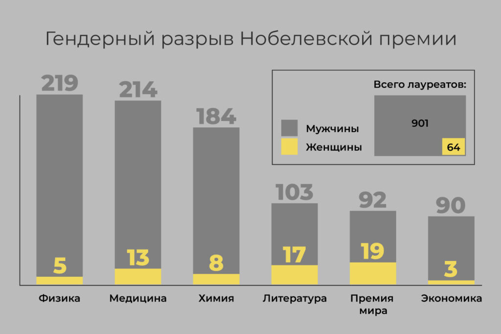 Комитет одной из наиболее престижных наград — Нобелевской премии — с начала XXI века наградил больше женщин, чем за все прошлое столетие: 35 исследовательниц в 2001–2023 годах и 30 — в 1901–2000-х. Однако традиции, которые позволяют мужчинам доминировать в академических кругах, никуда не делись. Это касается и Нобелевской премии.