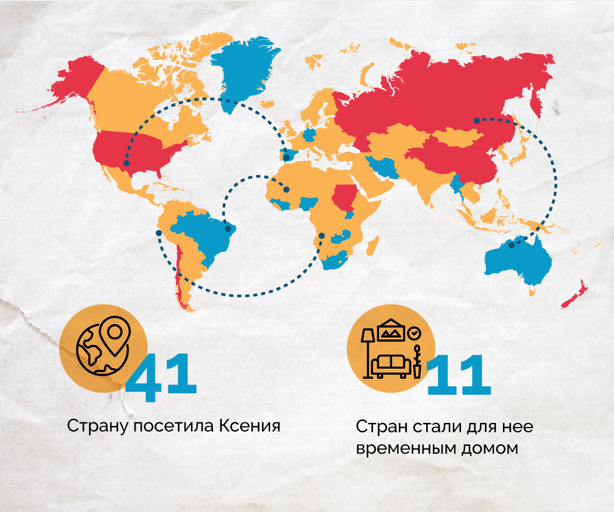 Ксении — 33. Почти половину своей жизни она провела в путешествиях по миру. Все началось с безобидного автостопа по Китаю, потом были Вьетнам, Камбоджа, Южная Америка. Сегодня она уже не может с ходу посчитать, сколько стран объехала и в скольких из них жила. То, что начиналось как хобби, в какой-то момент вышло из-под контроля.