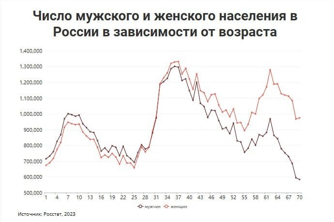 По данным Росстата на 2024 год, в возрастной группе от 0 до 4 лет на тысячу мальчиков приходится 943 девочки в среднем по России. Однако с возрастом это соотношение начинает сдвигаться, и женщин становится больше. Согласно словам Алексея Ракши, виной этому, если не брать в учет миграцию, — только мужская сверхсмертность.