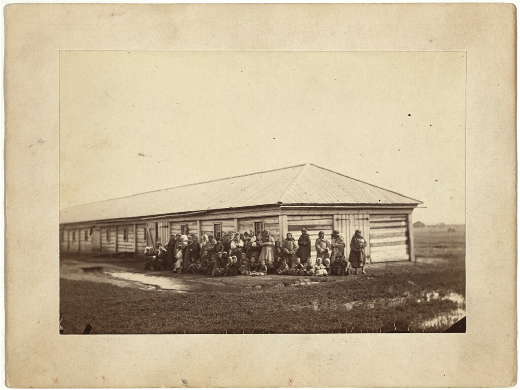 Джордж Кеннан, Группа ссыльных женщин с детьми стоят перед бараками, 1895. Источник: Отдел печати и фотографии Библиотеки Конгресса США