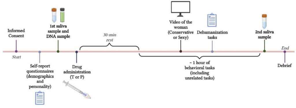 Сообщается, что исследователи провели два эксперимента: на первом его этапе испытуемым ввели тестостерон в виде назального геля, на втором, спустя две недели, — плацебо. В рамках эксперимента участникам показывали два видео с одной и той же женщиной, одетой либо невзрачно и по-домашнему, либо — подчеркнуто сексуально. В видео женщина в нейтральной манере отвечала на вопросы интервьюера. После показа видео мужчин просили описать то, какие эмоции испытывает женщина, а также предположить, какие у нее могут быть личностные качества.