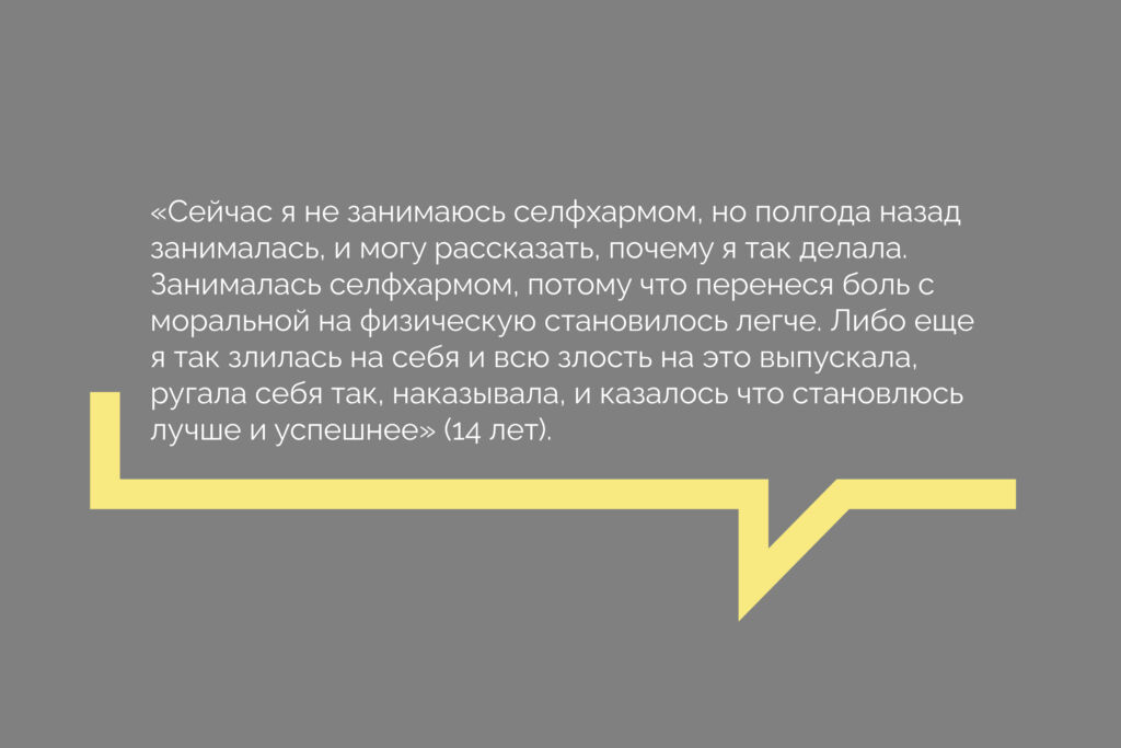 Фантазии могут быть связаны с насилием, однако многие приходят в чат «просто проораться», уверяет Анна. Одна девочка писала, что бы сделала со всеми своими родственниками: как бы она их всех закопала, сожгла и вообще, «когда все это кончится». К концу беседы перечитывала и писала: «Ты же понимаешь, что я никого не трону, да?»