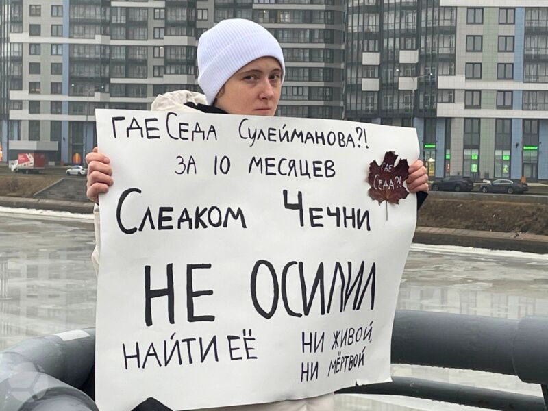 Лена Патяева, подруга бежавшей из дома и пропавшей без вести чеченки Седы Сулеймановой, снова вышла на одиночный пикет. Девушка встала с плакатом на мосту Ахмата Кадырова в Санкт-Петербурге. На плакате написано: «Где Седа Сулейманова? За 10 месяцев Следком Чечни не осилил найти ее ни живой, ни мертвой».