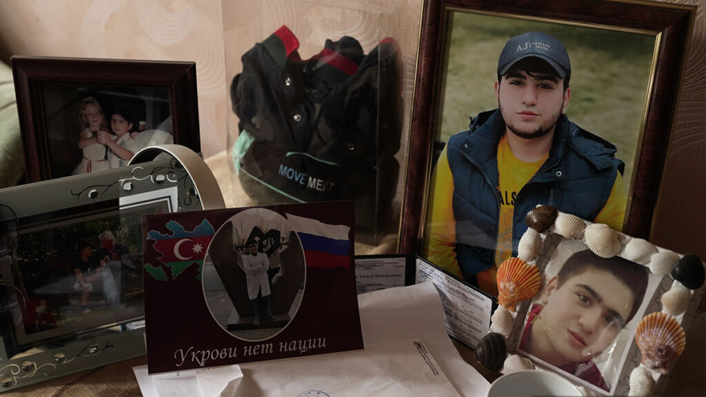 Женщина сидит у могилы. На каменной плите — цветочный венок с портретом сына и надписью «У крови нет нации». Тимур лежит у самого входа на кладбище — азербайджанская община Волгограда, несмотря на локдаун, помогла доставить тело на родину, в Гянджу, и достойно похоронить. Неподалеку стоит массивный обелиск с краном, из которого можно набрать воды, и портретом солдата, погибшего в Нагорном Карабахе.