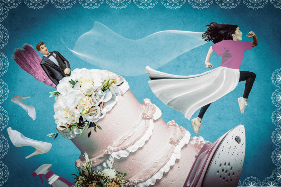 Причем современный цифровой фольклор — мемы, анекдоты, видео в тиктоке — показывает нам, что женщины на самом деле чувствуют подвох. В одном популярном в соцсетях видео девушка, нарочито ухоженная, надевает брачное кольцо — и тут же силой монтажа превращается в увешанную детьми и кастрюлями домохозяйку. Снимает кольцо — снова «тонкая и звонкая». Надевает — еще больше детей и кастрюль.
