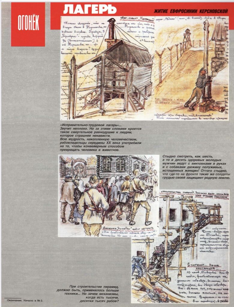 Я любила читать периодику и вообще уже читала хорошо, несмотря на возраст, и просматривала все подряд. Открыла я разворот этого “Огонька”, а там — комиксы по рассказам о Норильлаге Евфросинии Керсновской. Я увидела знакомое слово — Норильск. Хотя тогда, с 1988 по конец 1990 года, мы с родителями жили на материке, во Владимире, я знала, что я норильчанка, я оттуда. И когда увидела этот разворот, он показался мне очень важным, хотелось это сохранить.