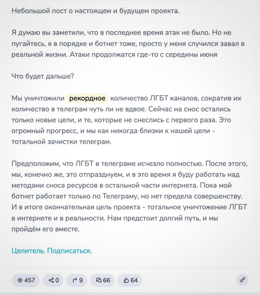 Атаки инициировал закрытый телеграм-канал «Империя Целителя», а об итогах онлайн-рейдов вскоре отчитался один из его лидеров под ником Целитель: «Окончательная цель проекта — тотальное уничтожение ЛГБТ* в интернете и в реальности. Нам предстоит долгий путь, и мы пройдем его вместе».