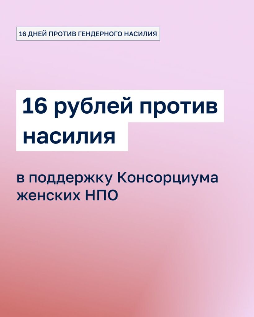 «Консорциум женских НПО» запускает акцию в честь «16 дней активных действий против насилия в отношении женщин и девочек». Юристки и правозащитницы предлагают внести свой вклад в защиту женщин по всей России, сделав пожертвование в размере 16 рублей (или больше) в пользу «Консорциума».