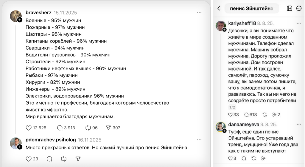 В российском медиаполе термин «пенис Эйнштейна» прижился в феминистских кругах. В социальных сетях об этом пишут фемпаблики, а молодые феминистки снимают рилсы*. В Threads* много веток содержит комментарии с этим термином.